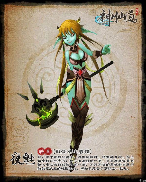 描述:别人眼中绝对的魔女,冷艳的眼神,妖艳的身材,加上妖魔级别的实力;她又有柔情的一面,哥哥魔将武罗是她入魔以后仍然记得的一个;不得不提的是她对有恩于她的万妖皇的绝对忠心,哪怕只是受了万妖皇一点恩。